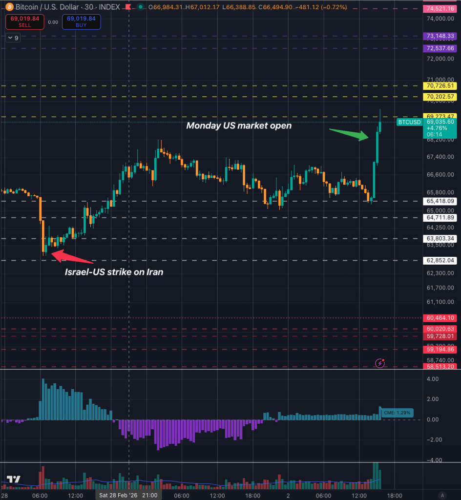 Bitcoin jumped over 6% to threaten $70,000 during Monday’s U.S. market open even as the broader macro environment appears risk-off.