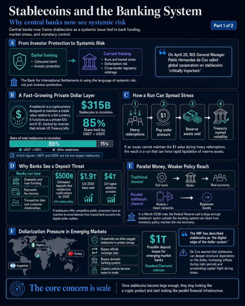 The Federal Reserve, in a March 2026 note on payment stablecoins and cross-border payments, added a further complication: a large enough stablecoin sector outside the banking system can blunt how monetary policy reaches the real economy, because the Fed’s tools work through banks, and a parallel network that bypasses them weakens their reach.