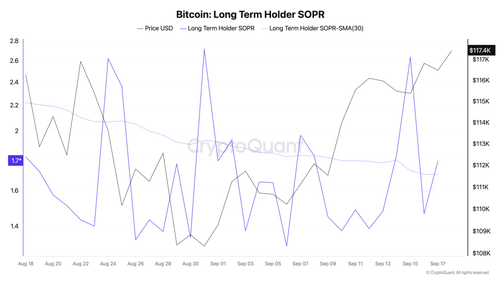 Bitcoin’s long-term holder SOPR from Aug. 18 to Sep. 17, 2025 (Source: CryptoQuant)