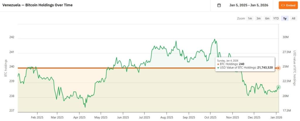 Data from Bitcoin Treasuries credit the Venezuelan government with holding just 240 Bitcoin, a position valued at approximately $22 million. On its own, such a balance is a rounding error, irrelevant primarily to global liquidity or price discovery.